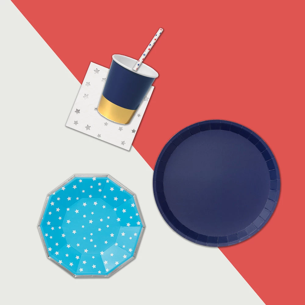 Includes 10 large plates, 10 small plates, 10 cups, 25 straws, and 25 napkins.
