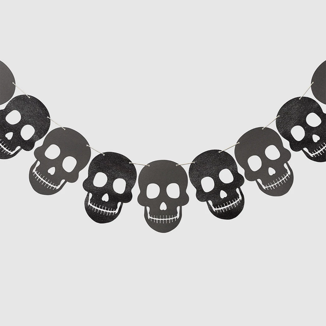 Add a spooky touch to your Halloween party with this banner. Adorned with a mix of black glittery and matte skulls, it can hang from any wall or doorway.