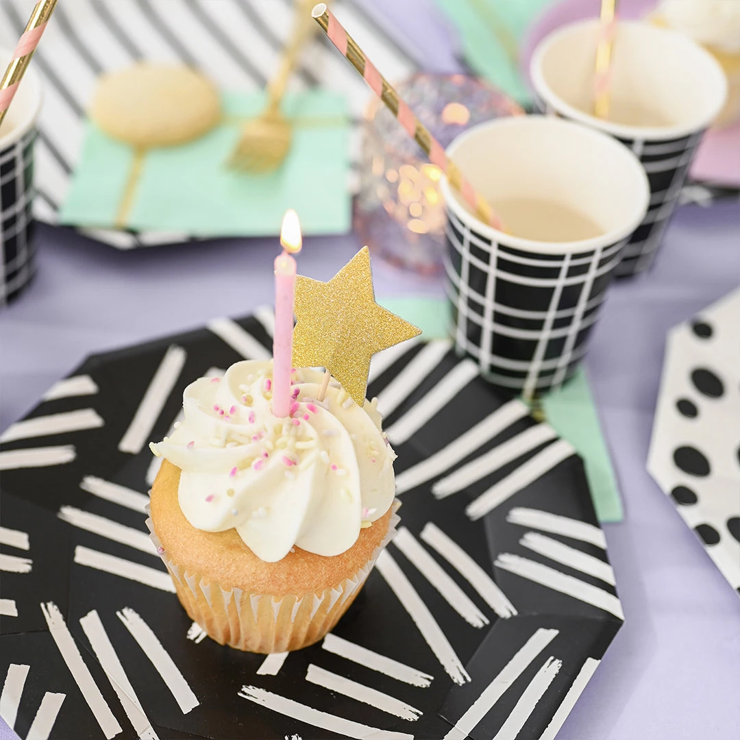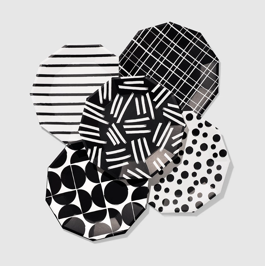 The artistic geometric designs on these large plates will turn heads on any table. The black-and-white palette lends a cosmopolitan vibe, and the plates are sturdy enough to handle any dish. Includes 10 plates.