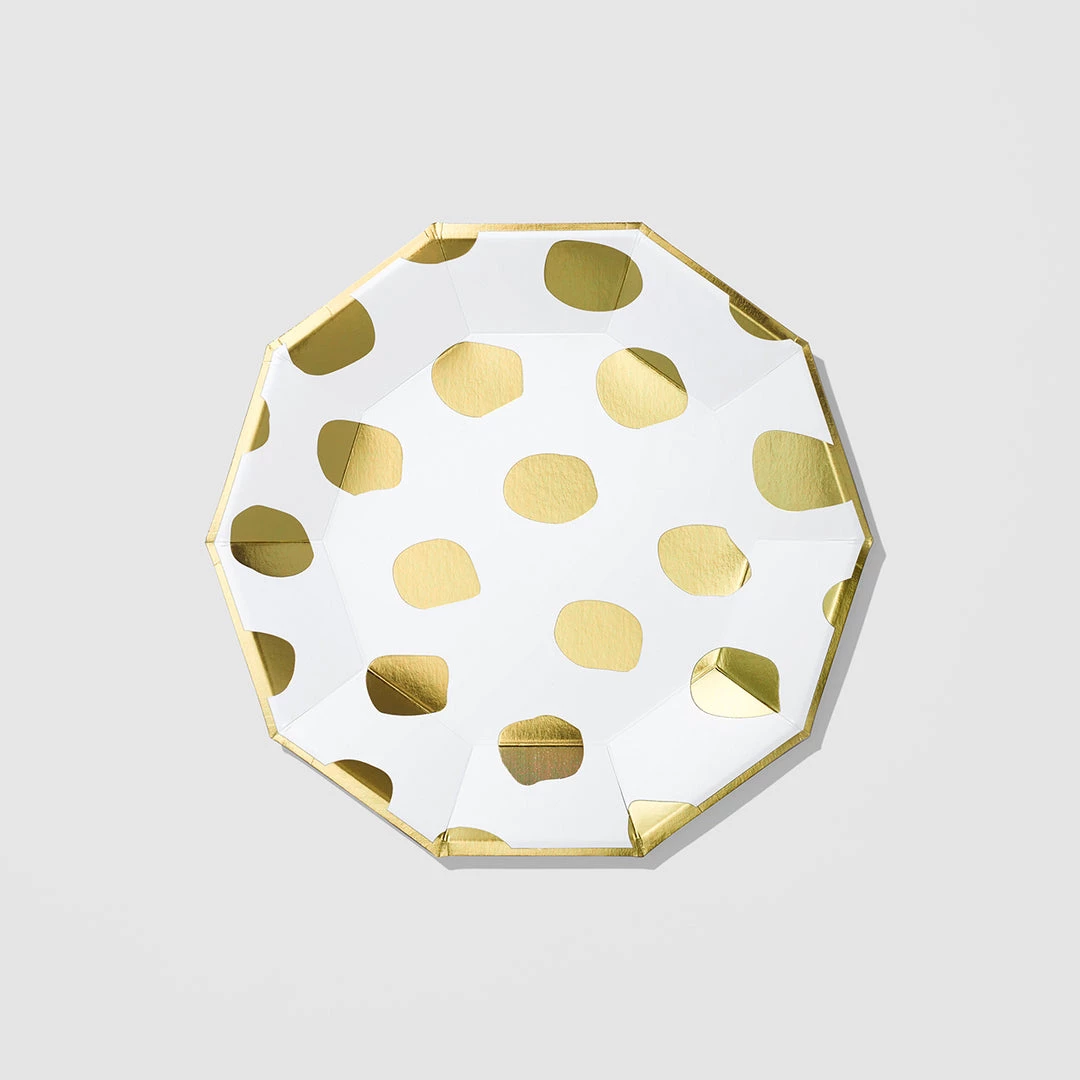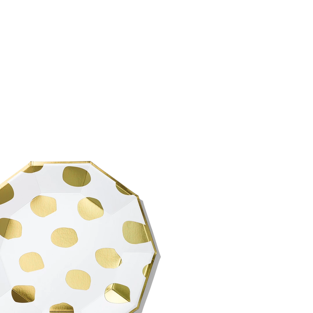 This updated take on polka dots is perfect for any occasion, no matter how fancy. With painterly blots of gold on crisp white, it’s a fun and playful design that’s also elevated. Includes 10 plates.