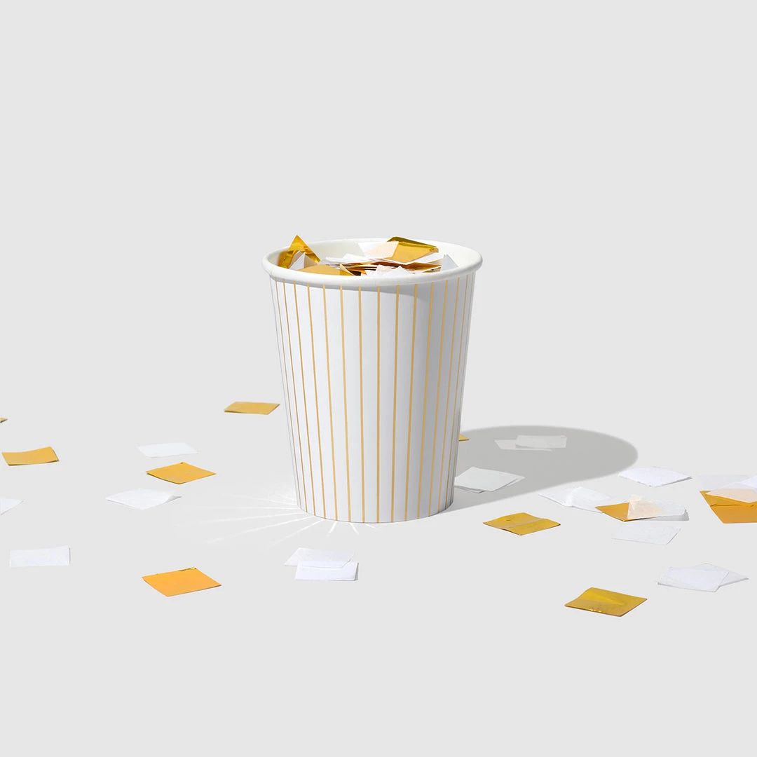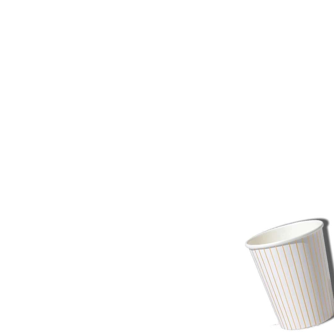 You can’t go wrong with this classic cup. It’s made from crisp white that’s thinly striped with gold for an upscale but uncomplicated vibe. Includes 10 cups.