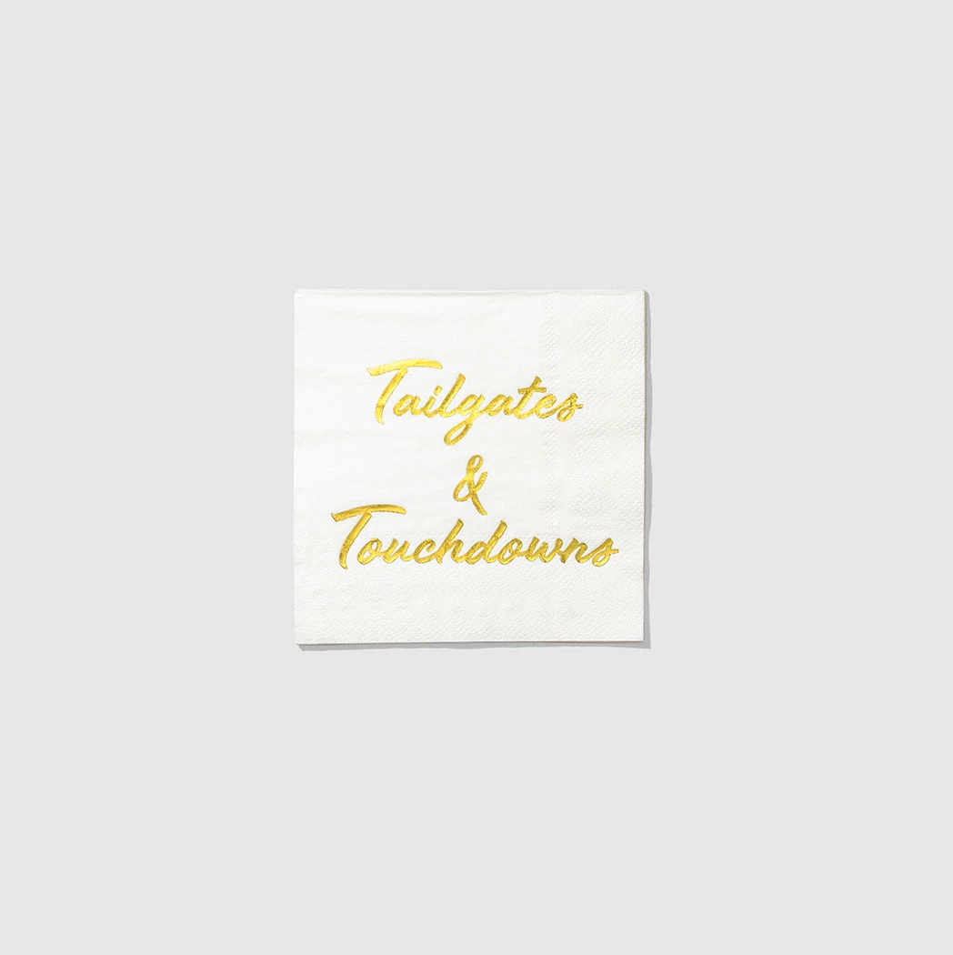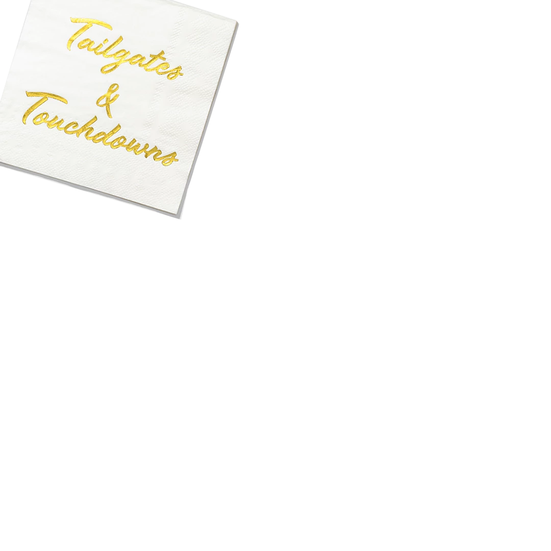 These white and gold “Tailgates & Touchdowns” cocktail napkins are a must for a winning party. Includes 25 napkins.